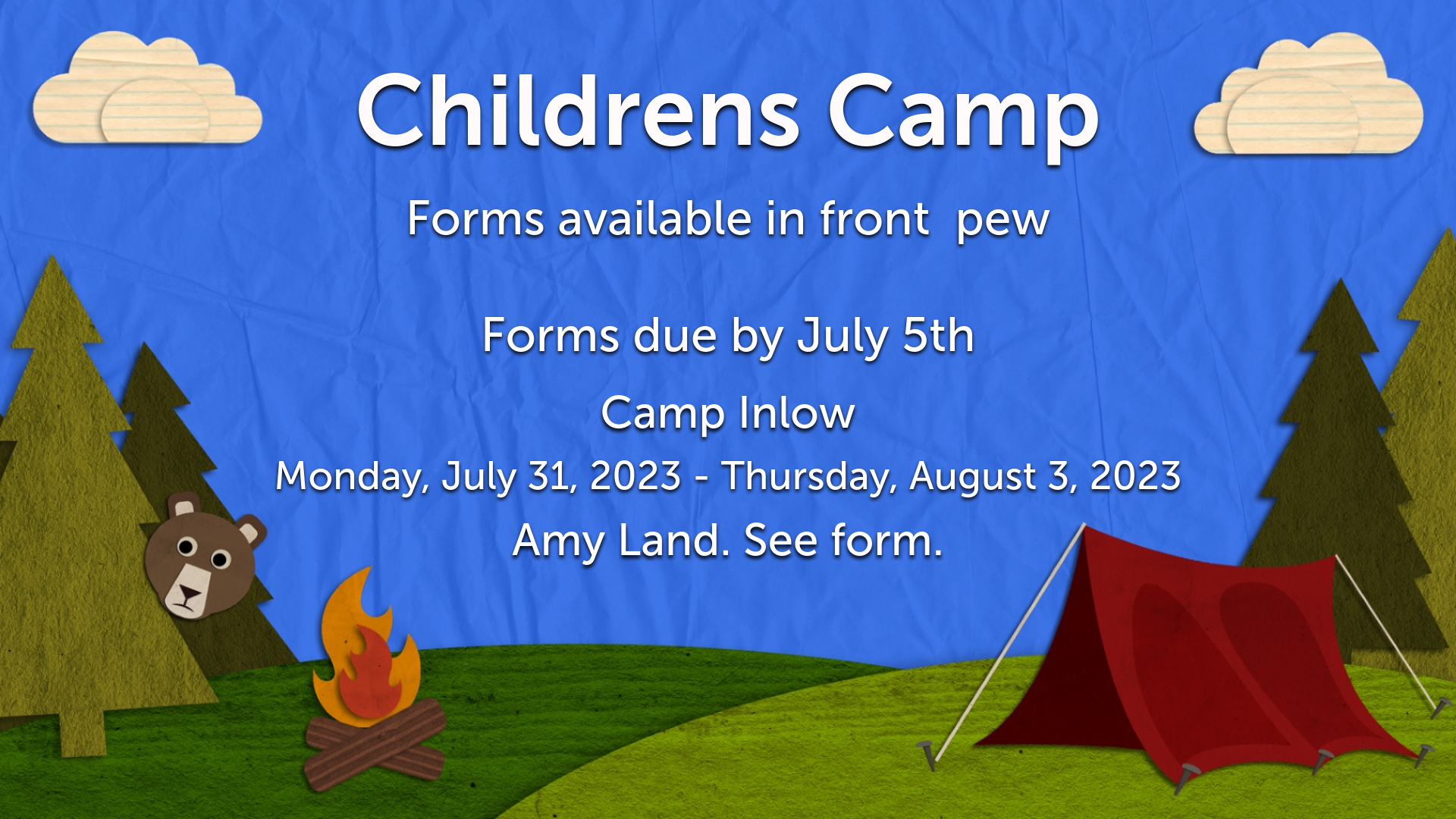 July 5, 2023 @ 8:00 am - 5:00 pm Children’s Camp Registration Deadline Camp Inlow 2565 Co Rd 161, Philadelphia, MO 63463, Philadelphia, MO, United States Children's Camp Registration due by July 5th Registration PDF.
